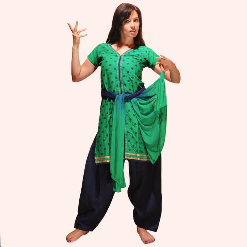 Сине-зелёный шальвар камиз — яркий повседневный комплект традиционной индийской одежды. В комплект входят удлиненная зелёная туника (камиз), шаровары синего цвета (шальвар) и шифоновый сине-зелёный шарф (дуппата). Туника украшена аккуратной и тонкой вышивкой. Материал — 100% хлопок и натуральный шифон. Размер 46-48.